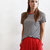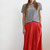 LA MODELLA E' ALTA 177 CM E INDOSSA LA TAGLIA 42 NELLA VARIANTE FLAME SCARLET.